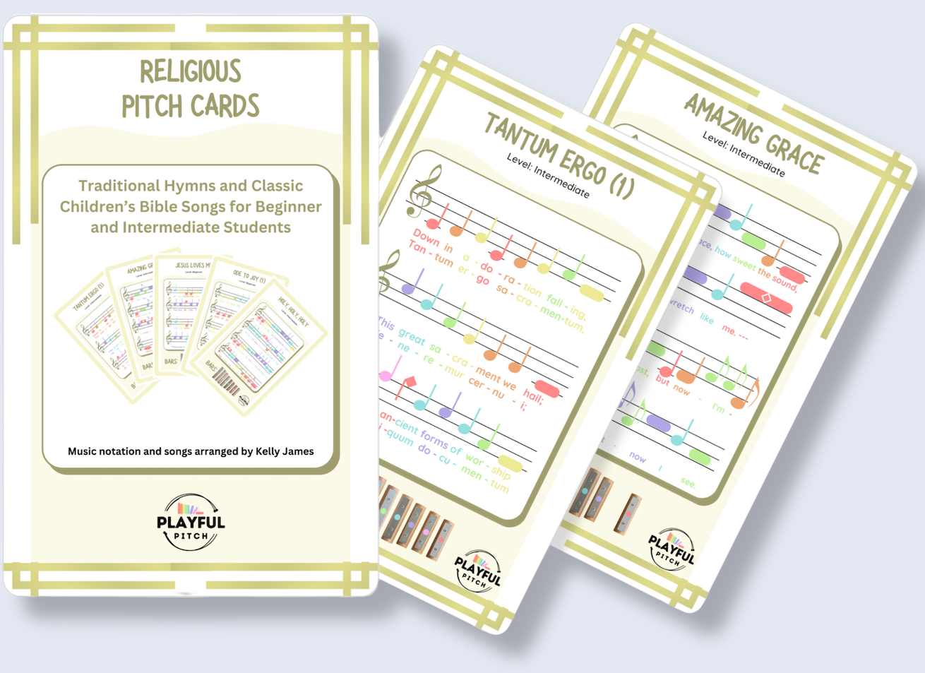 - Christmas + Religious pitch cards bundle: includes 6 popular Christmas songs (religious & secular), and 6 Religious songs (Catholic & Christian Hymns, and children’s Bible songs.)