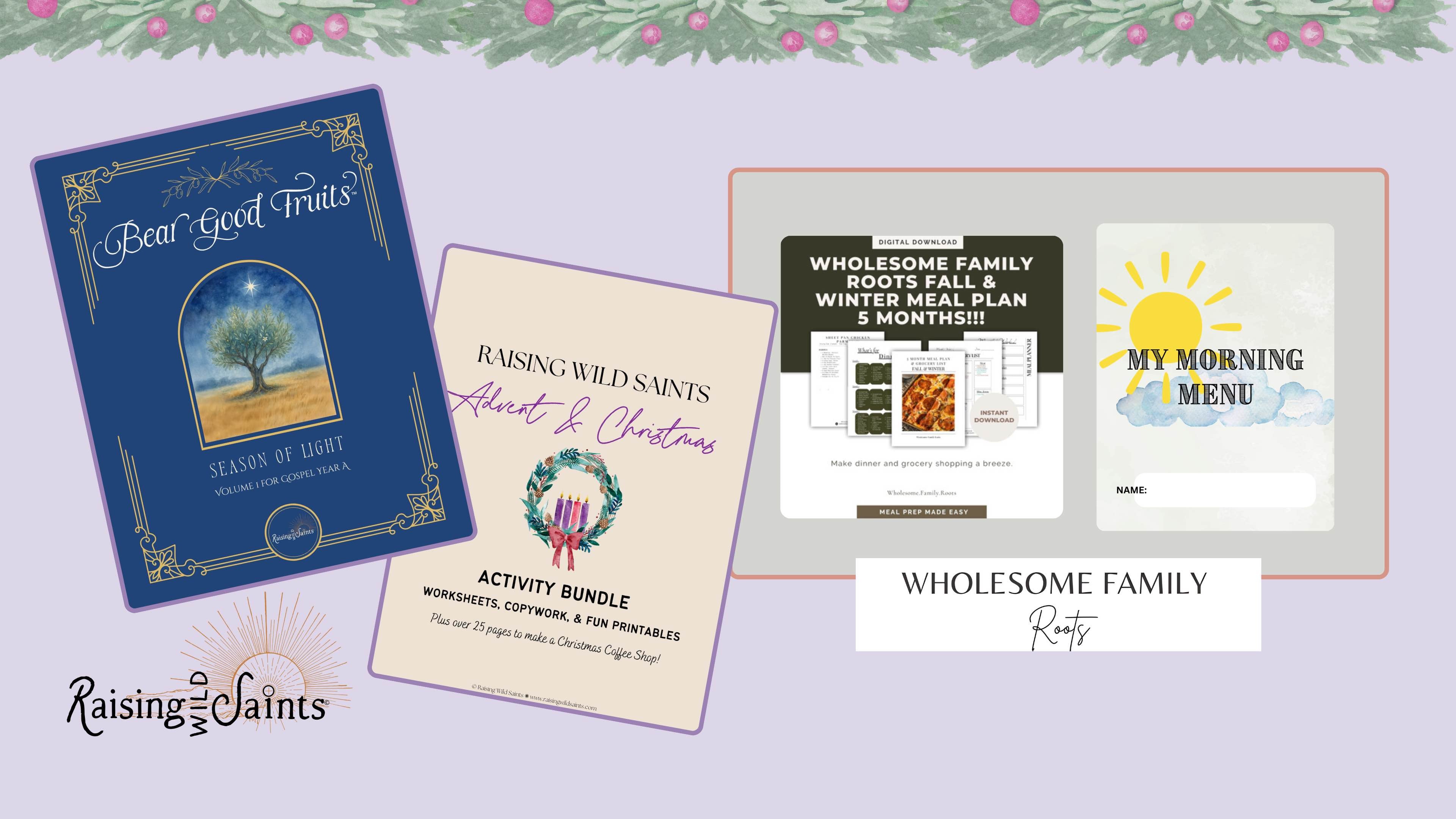 2. "Bear Good Fruits" - A Liturgical family-style Catechism Lesson book and "Advent and Christmas Activity Bundle" from RAISING WILD SAINTS ($60)