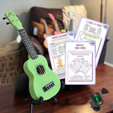 - Ukulele song cards featuring 7 familiar children’s songs with color-coded chords for easy, intuitive playing.