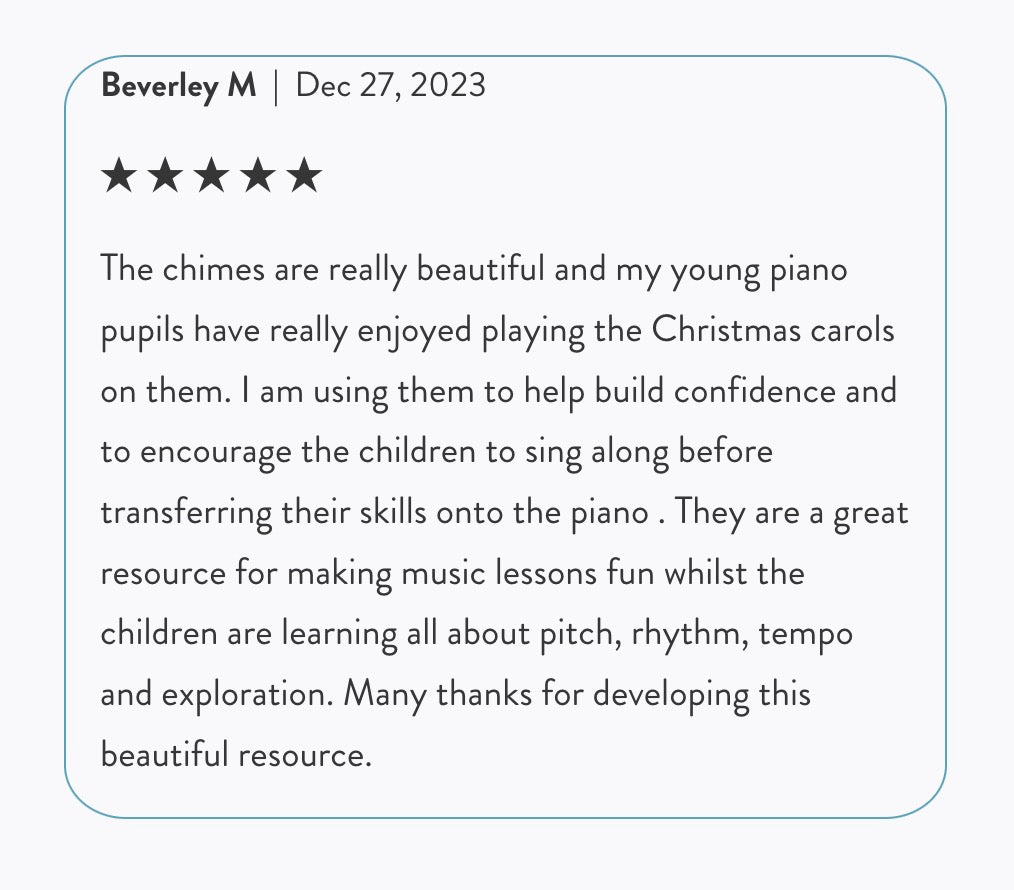Tuned to a C major scale (C5-C5), each pitch bar is professionally tuned and quality checked before leaving the factory, to ensure a quality, accurate, beautiful sound for every set we send out!