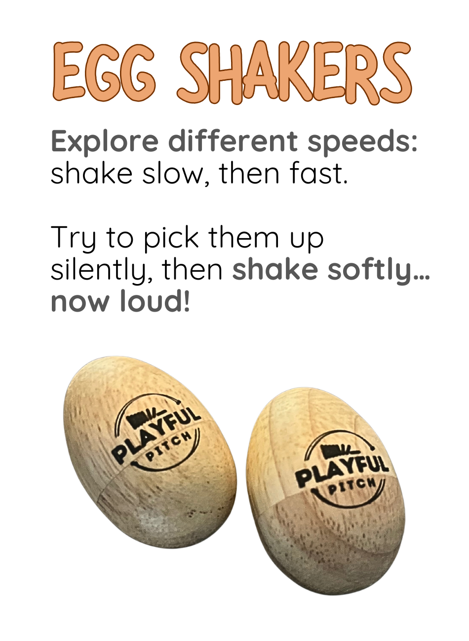 - Egg Shakers – a pair of wooden egg shakers, small and easy to hold, great for exploring soft vs. loud sounds and fast vs. slow rhythms.
