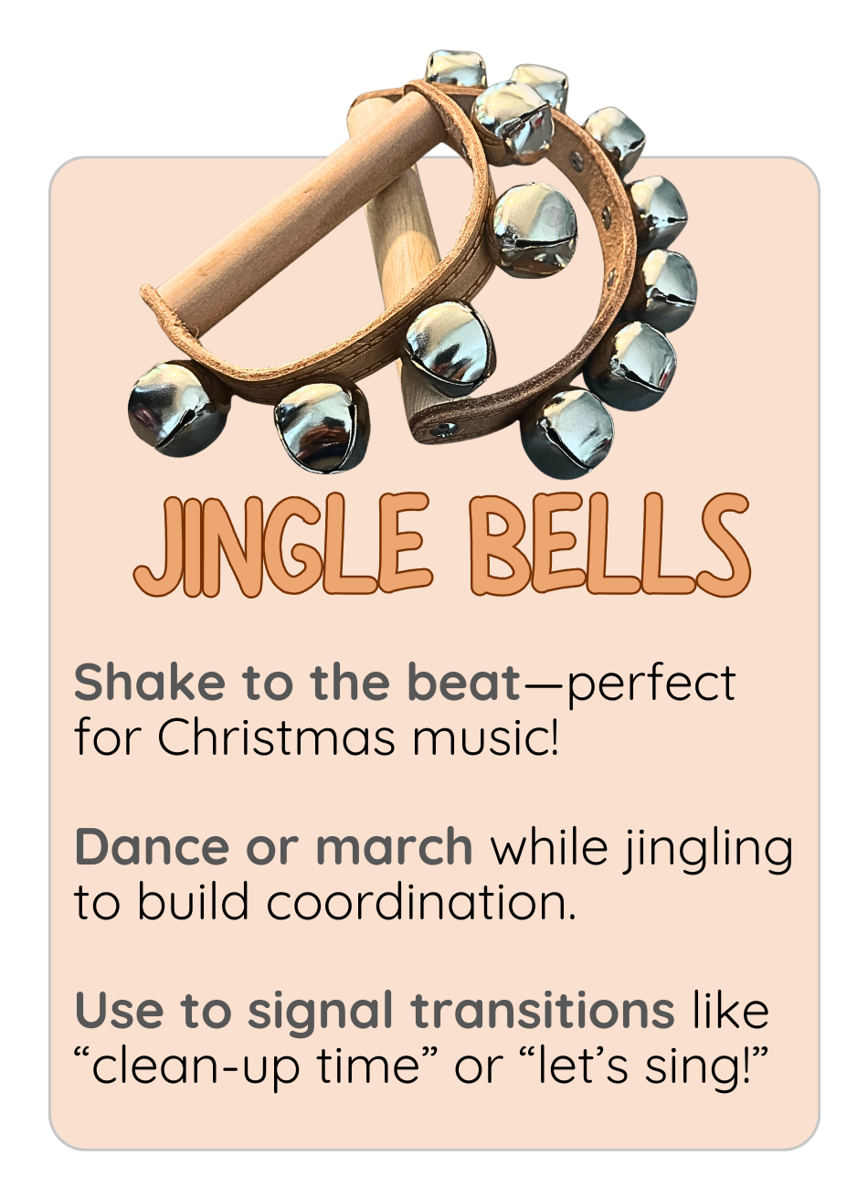 - Jingle Bells: Shake to the beat—perfect for Christmas music! Dance or march while jingling to build coordination. Use to signal transitions like “clean-up time” or “let’s sing!”