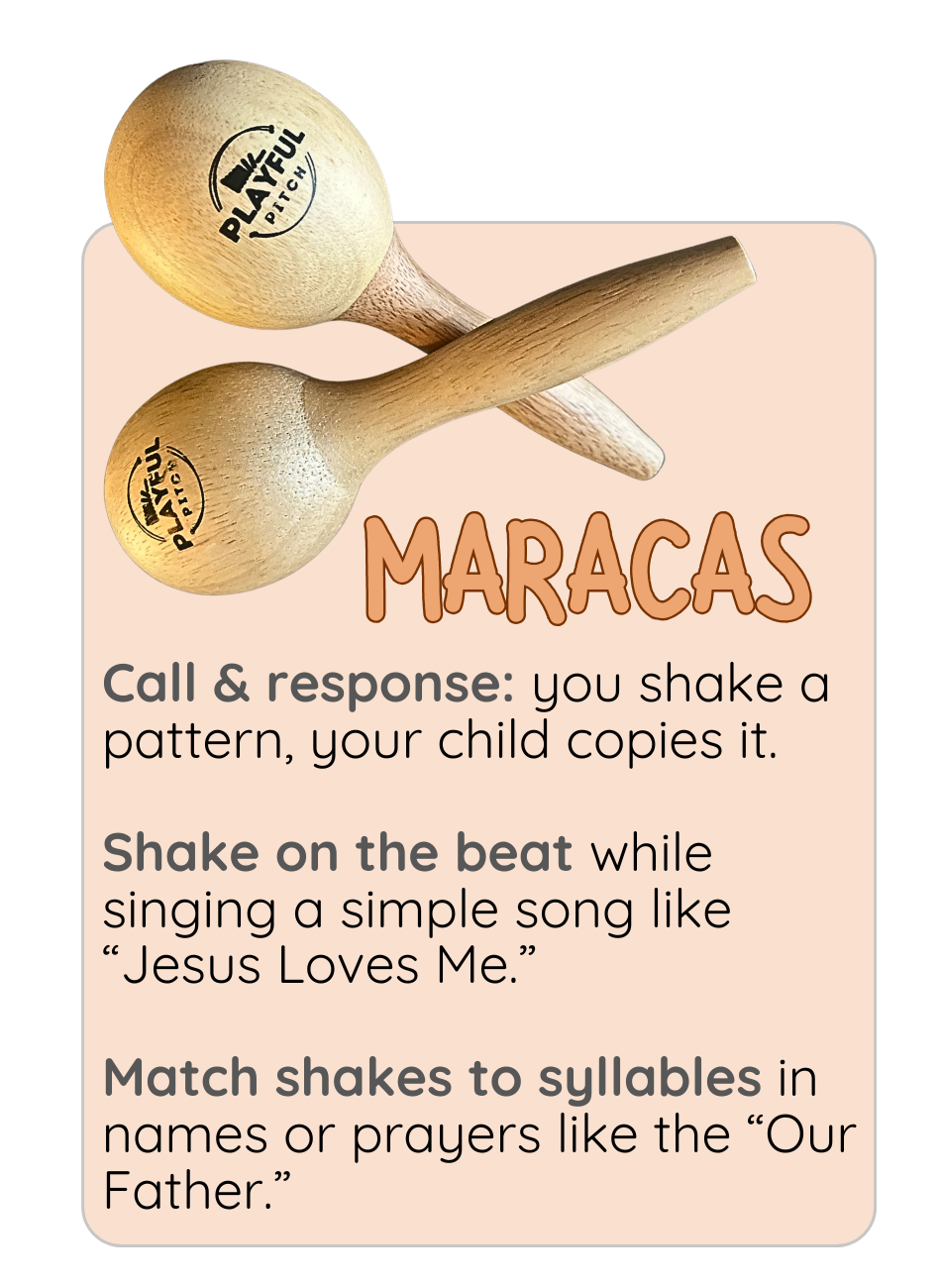 - Maracas: Call & response: you shake a pattern, your child copies it. Shake on the beat while singing a simple song like “Jesus Loves Me.” Match shakes to syllables in names or prayers like the "Our Father."