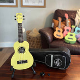 Finished in a smooth satin pastel yellow over real mahogany wood, this soprano ukulele includes marbled acrylic color dots set into real wood — soft, subtle colors that don’t overpower but instead blend into the natural fingerboard, making each ukulele uniquely its own. These color dots guide finger positions to match the color-coded chords in our song cards.